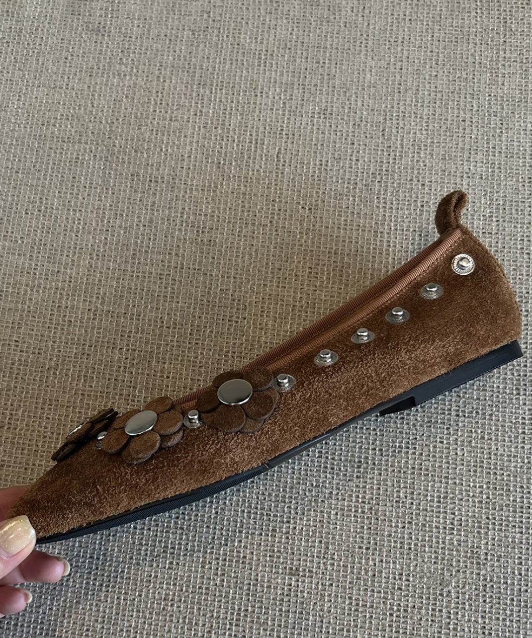 Brown Suede Floral Rivet Splicing Flat Shoes For Women