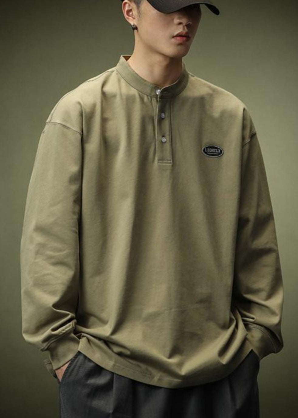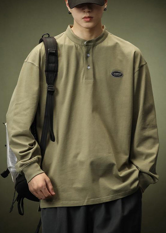 Simple Black Button Solid Cotton T Shirt Men Spring