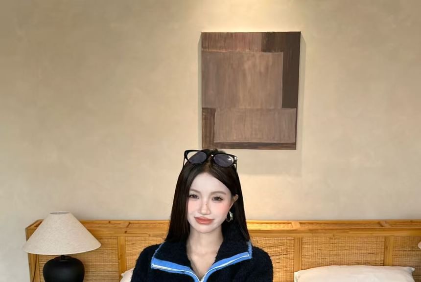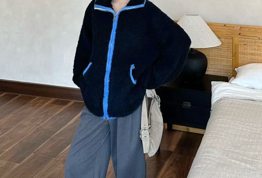 Stand Collar Plain Contrast Trim Fluffy Zip Jacket