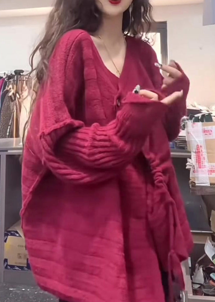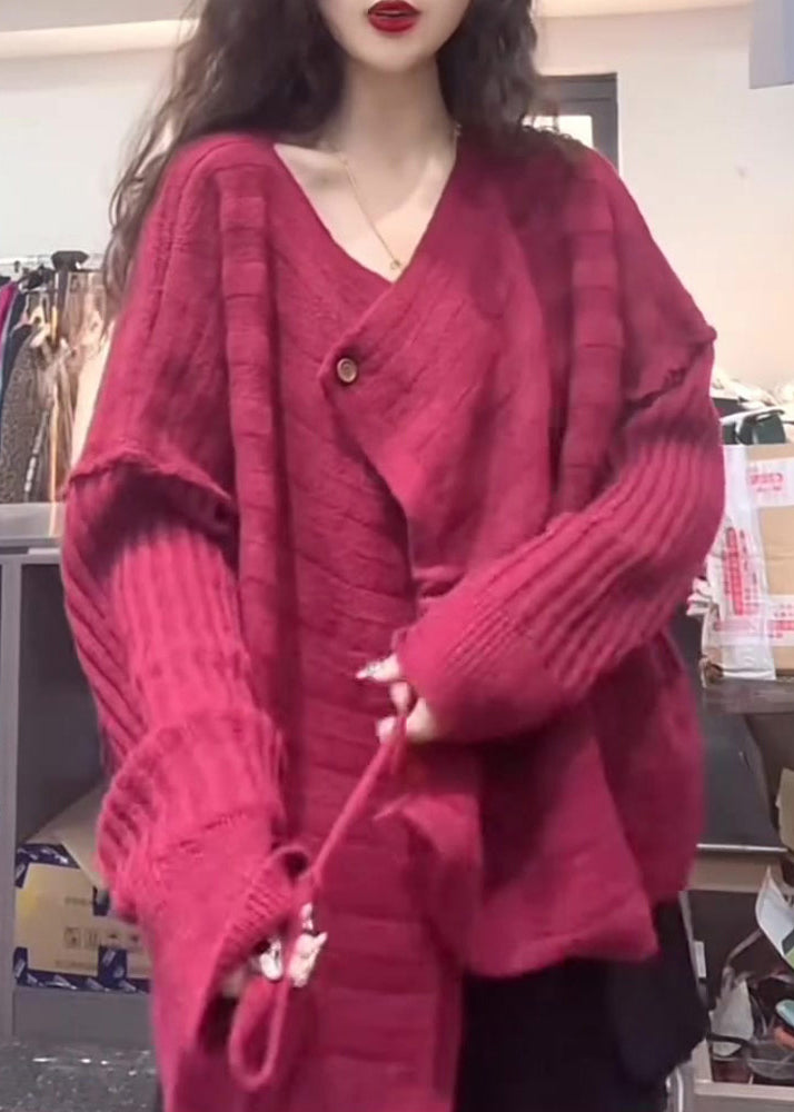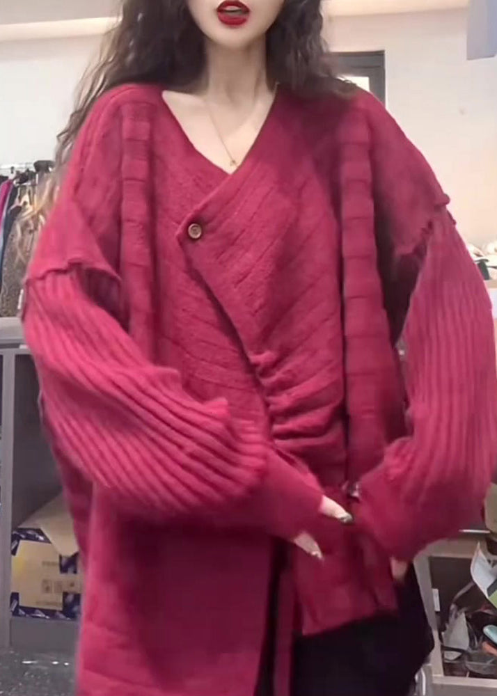 Style Rose V Neck Cinched Asymmetrical Patchwork Knit Top Fall WE006