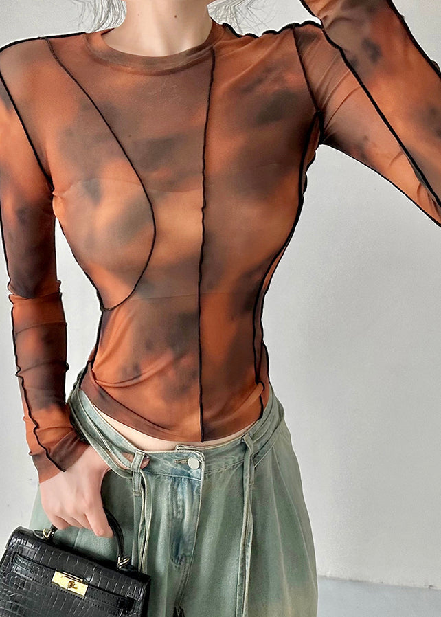 Stylish Brown O Neck Tie Dye Tulle Blouses Top Fall AL1067