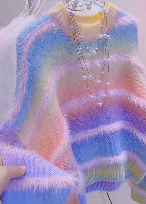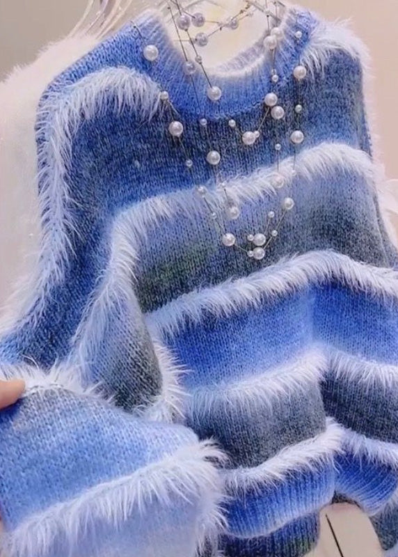 Stylish Gradient Color Green O-Neck Striped Cozy Cotton Knit Sweaters Winter RK014