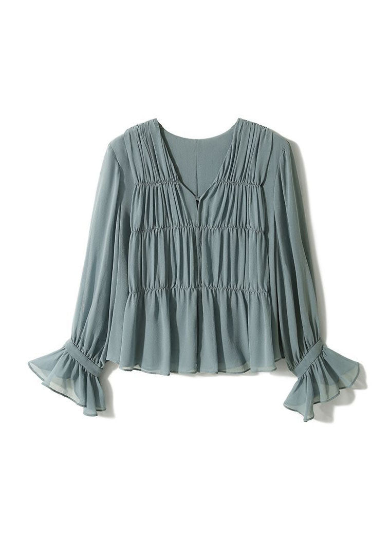 Luxurious Light Brown V-Neck Wrinkled Patchwork Cotton Blouse Top for Spring.