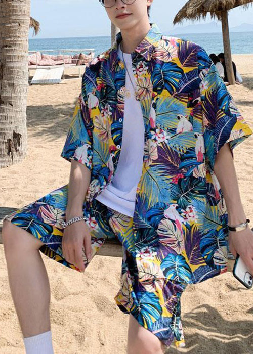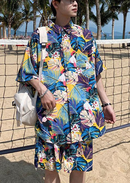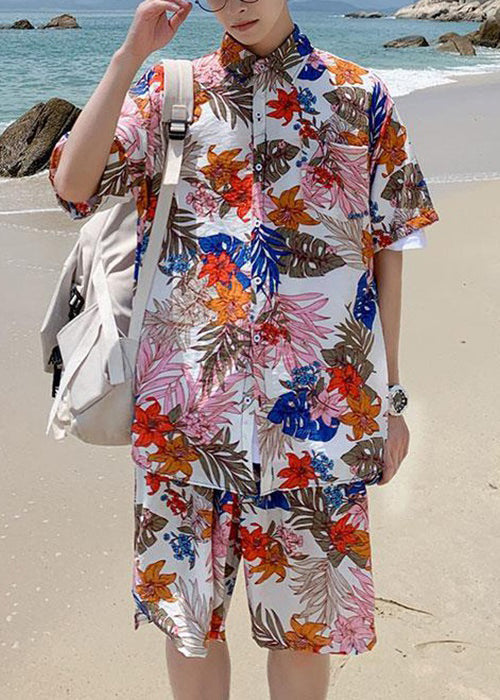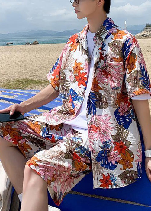 Luxurious Pink Peter Pan Collar Printed Cotton Men's Two-Piece Set with Short Sleeves - A Stylish Choice