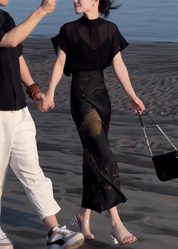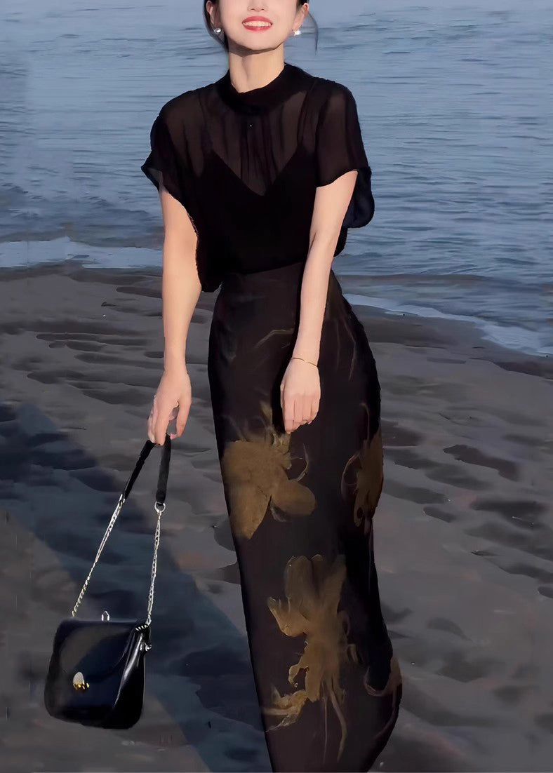 Italian Black Lace Up Tops And Print Skirts Chiffon Two Pieces Set Summer
