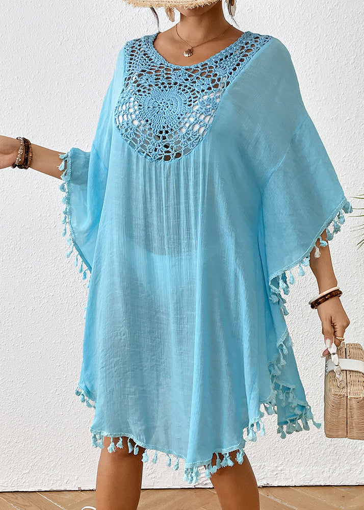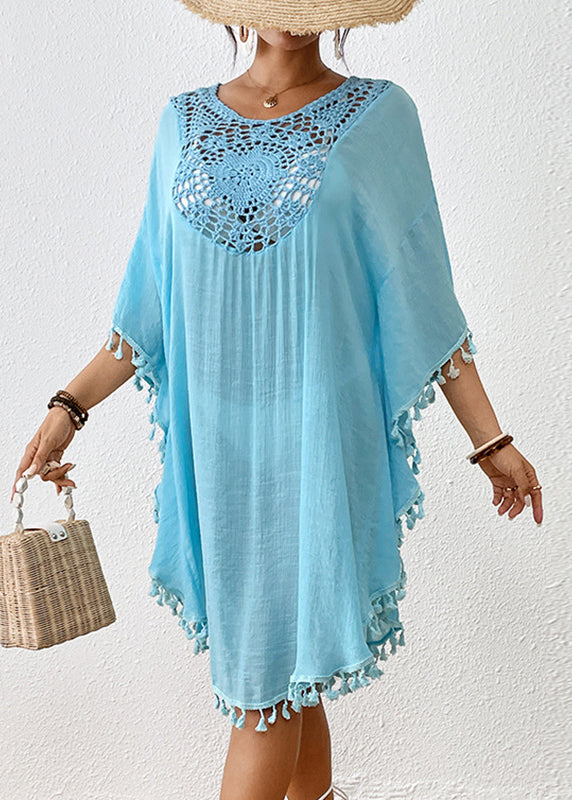 Trendy Black O-Neck Hollow Out Patchwork Tassel Swimwear Smock VC051