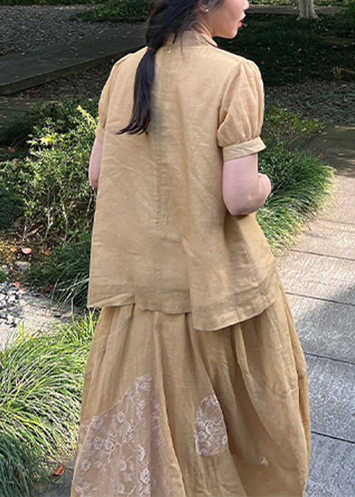 Art Yellow Lace Patchwork Tops And Skirts Two Pieces Set Summer