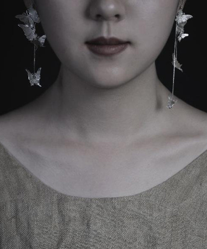 Unique White Sterling Silver Asymmetric Enamel Butterfly Drop Earrings QJ009