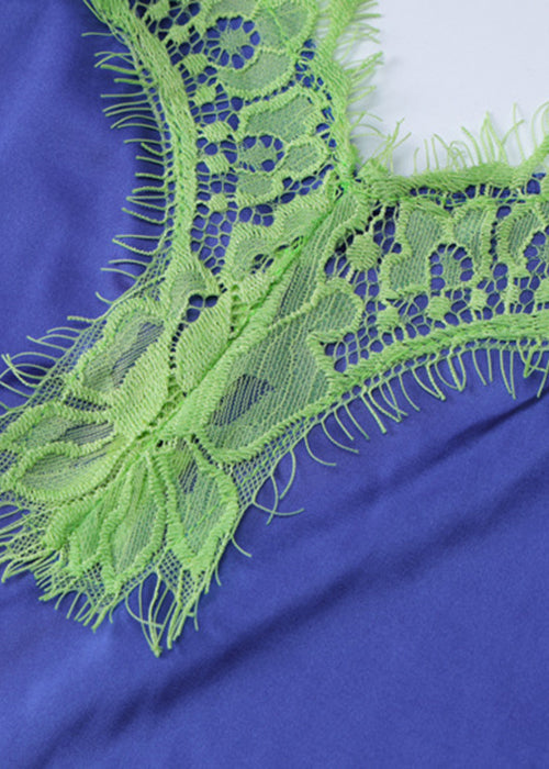 V Lace Patchwork Dress Bohemian Neck Spaghetti Strap Blue