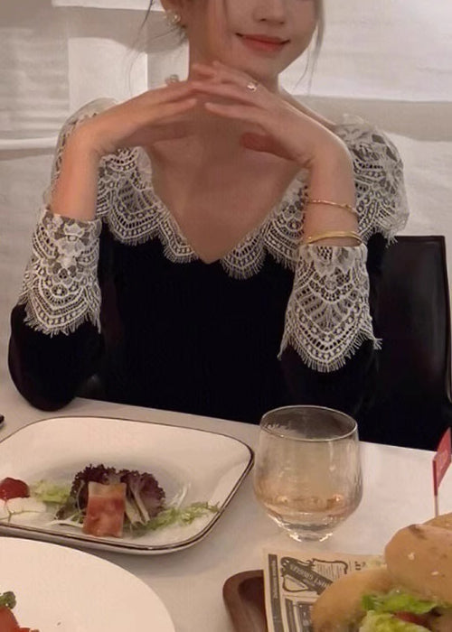 Velvet Neck Silk Lace Dresses Spring French V Patchwork Black