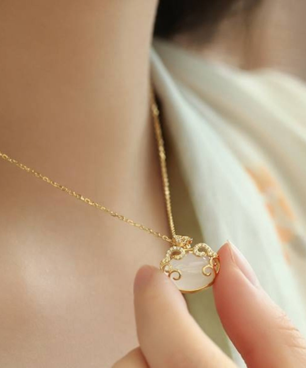 This exquisite pendant necklace boasts a lavish blend of vintage gold and sterling silver, adorned with overgild zircon and a stunning jade pendant.