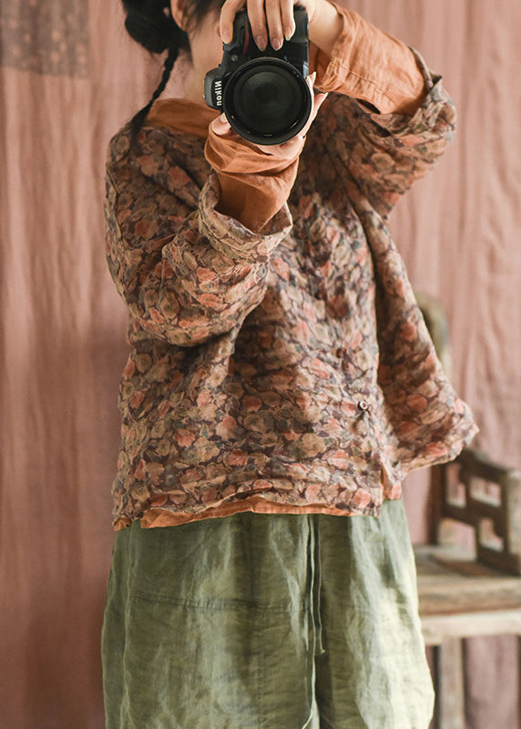 Vintage Green Button Print Linen Blouse Long Sleeve AU1059
