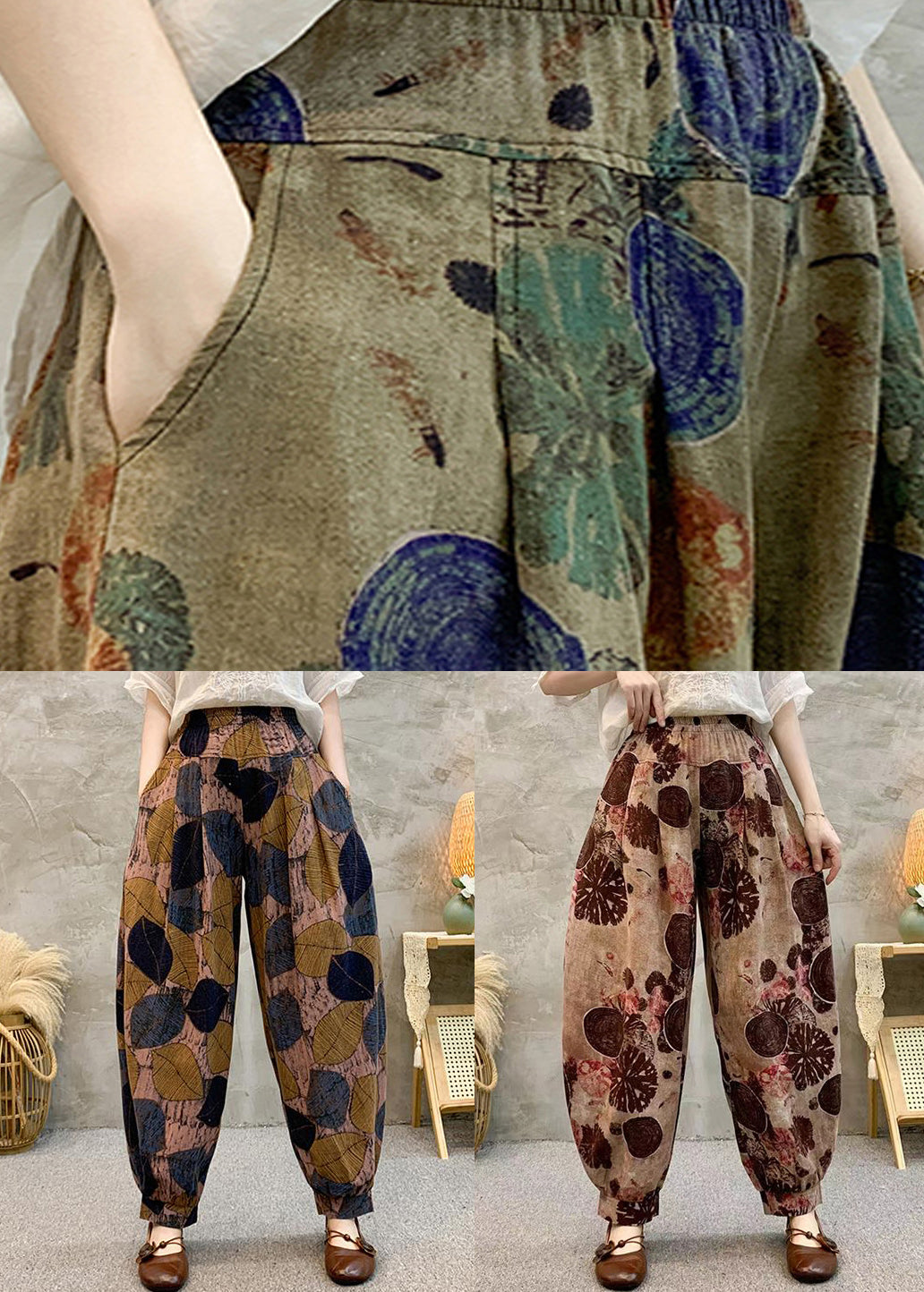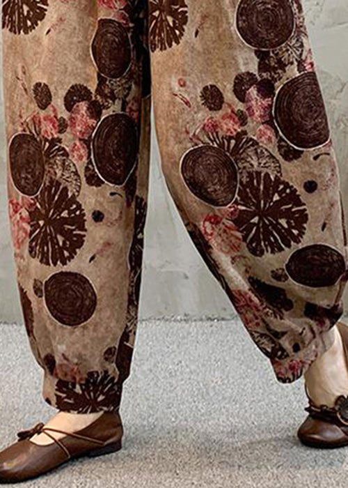 Vintage Light Brown Pockets Elastic Waist Cotton Harem Pants Summer RE039