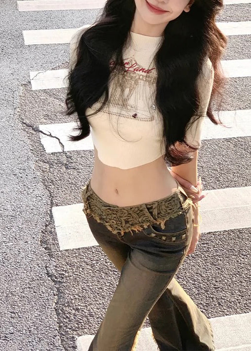 Experience the ultimate in elegance and exclusivity with our Vintage Low Waist Patchwork Lace Denim Flared Trousers, perfect for the spring season.