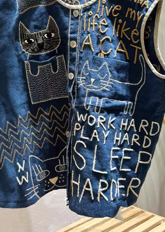 Vintage Navy Embroideried Linen Beach Vest Sleeveless