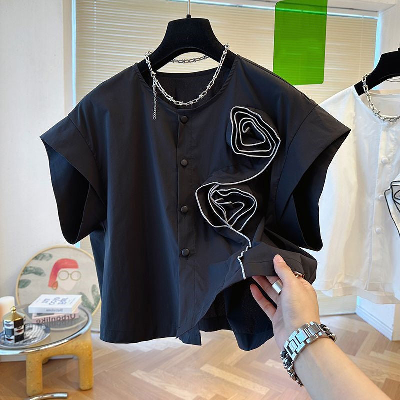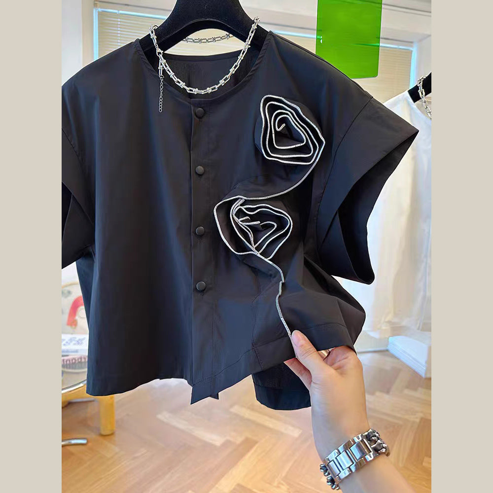 Vogue White O-Neck Rose Floral Button Shirts Batwing Sleeve VB1081