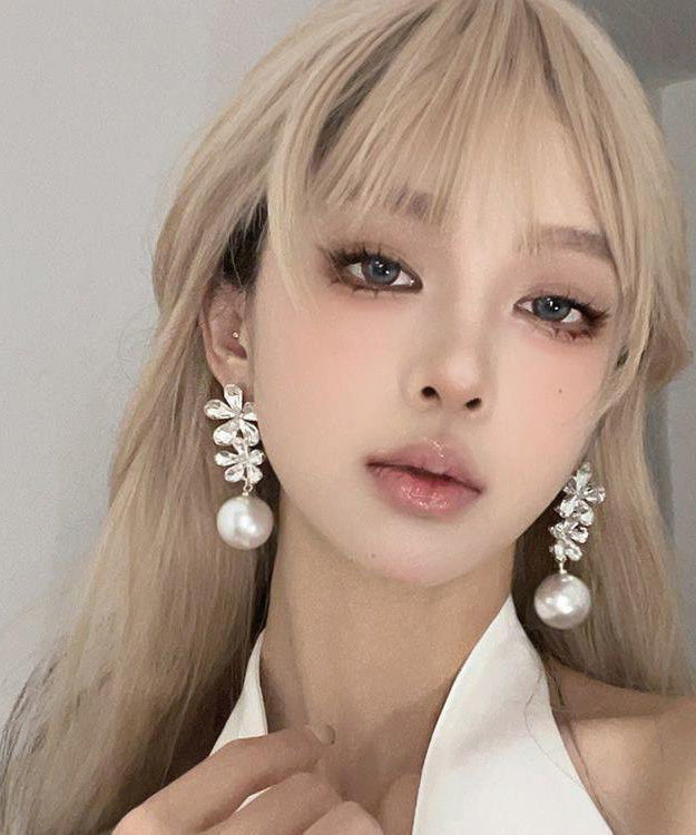 White Zircon Copper Floral Drop Earrings Pearl Overgild Stylish