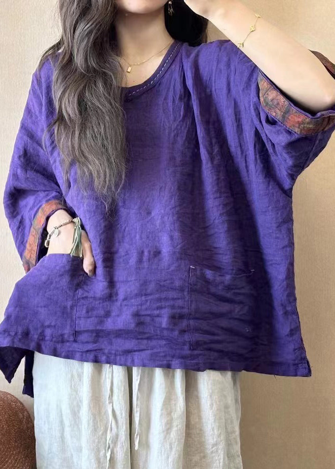 Wine Red Pockets Side Open Linen T Shirts V Neck Spring GG015