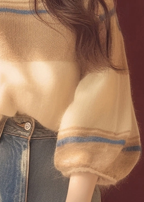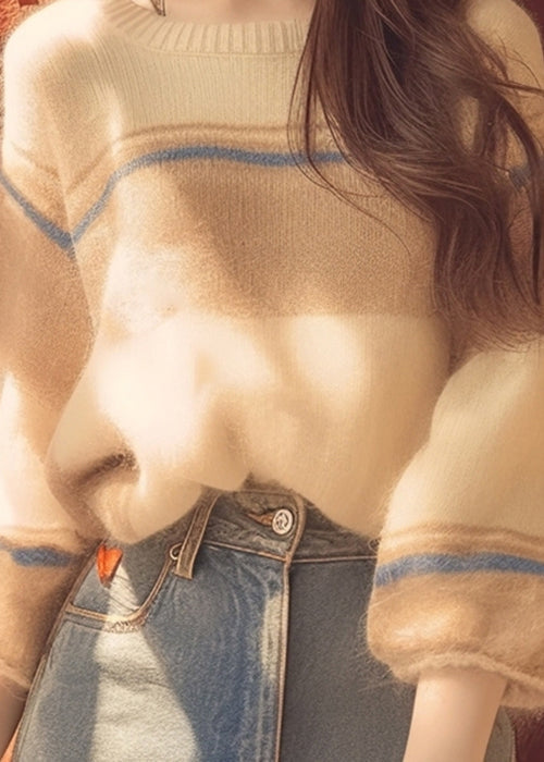 Women Apricot O Neck Cozy Patchwork Knit Sweater Winter WM012