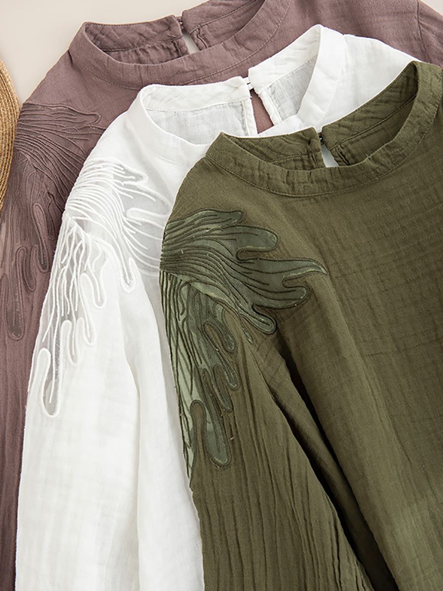 Women Autumn Artsy Embroidery Stand Collar Cotton Blouse AI1076