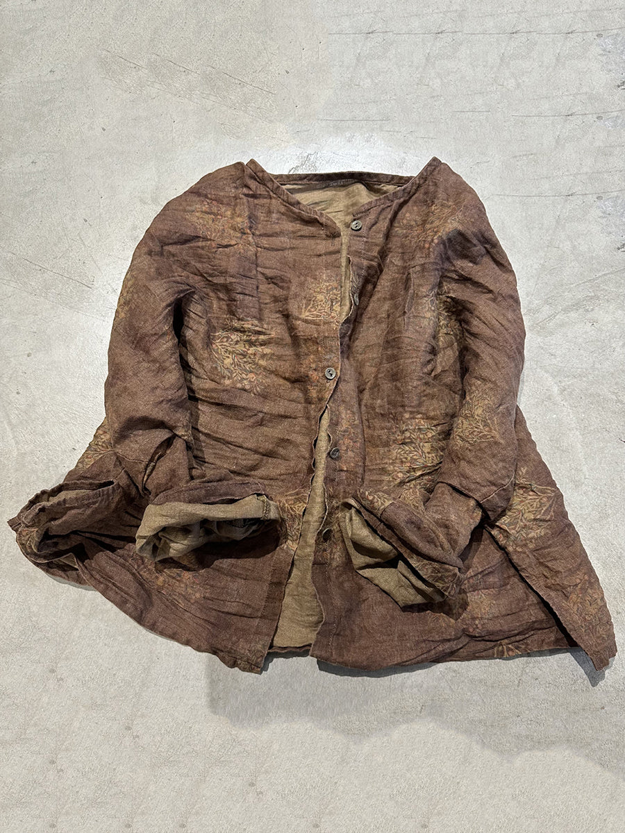 Constructed from 100% linen, this garment showcases an artistic floral motif. With an O-neck collar and full-length raglan-style sleeves, it boasts a vintage-inspired design. Perfect for the cool autumn and spring months.