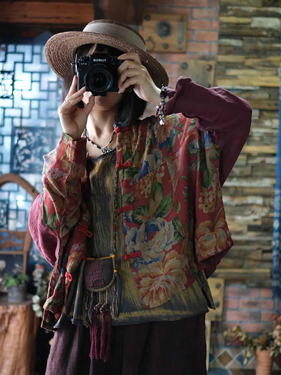 Crafted from a durable and breathable 100% cotton material. this coat boasts a striking colorblock design featuring delicate flower patterns. The stand collar adds a touch of sophistication. while the full raglan sleeves provide a vintage touch. Perfect for the cooler seasons of autumn and winter.