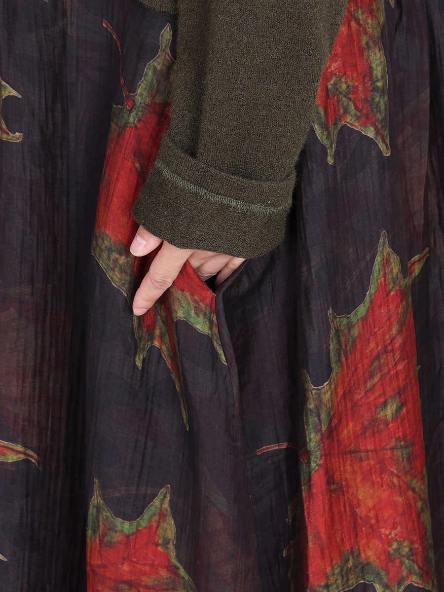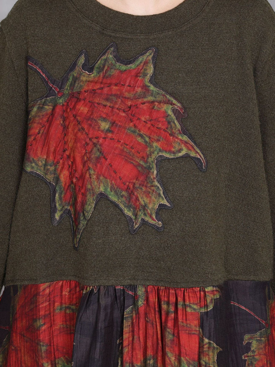 Women Autumn Maple Leaf Irregular Hem O-Neck Loose Dress AI1054