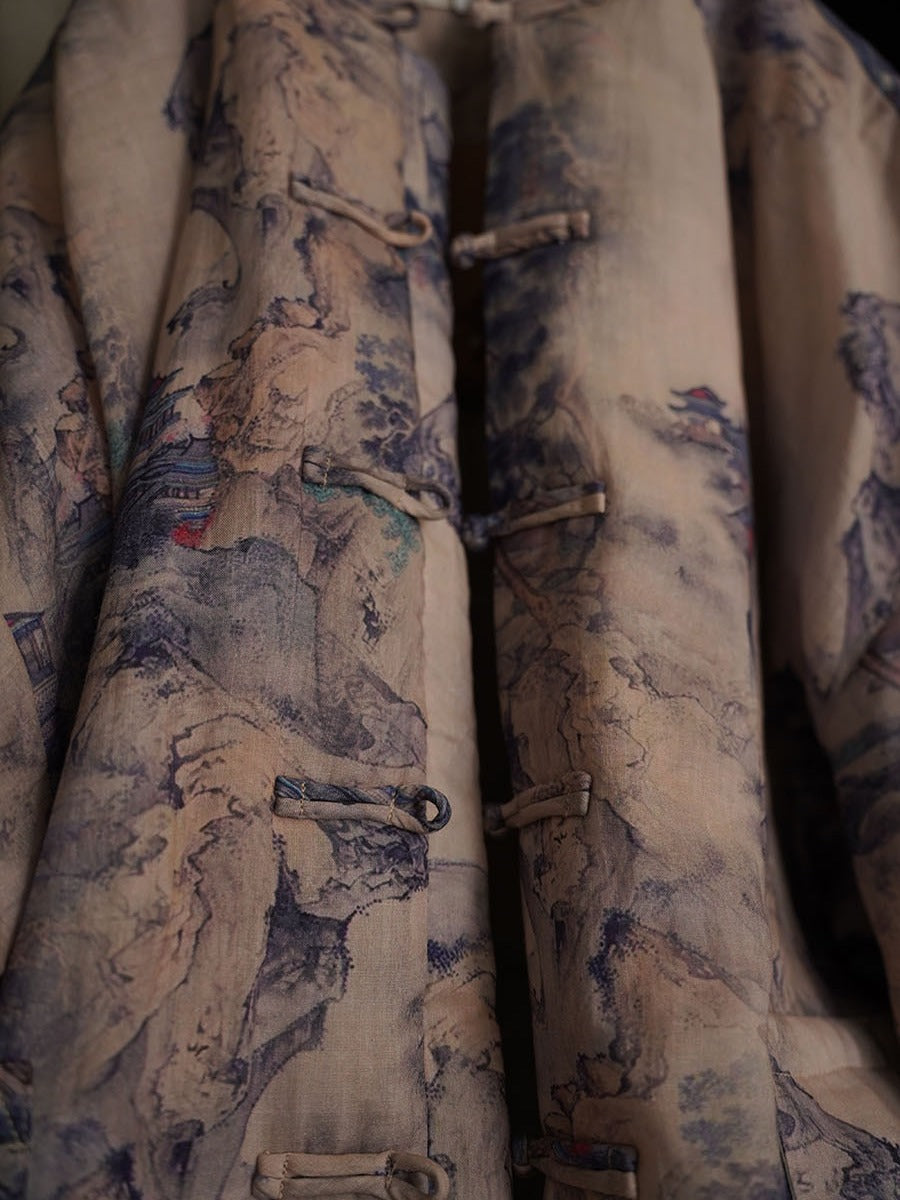 Women Autumn Vintage Print Button Stand Collar Ramie Coat AT1053