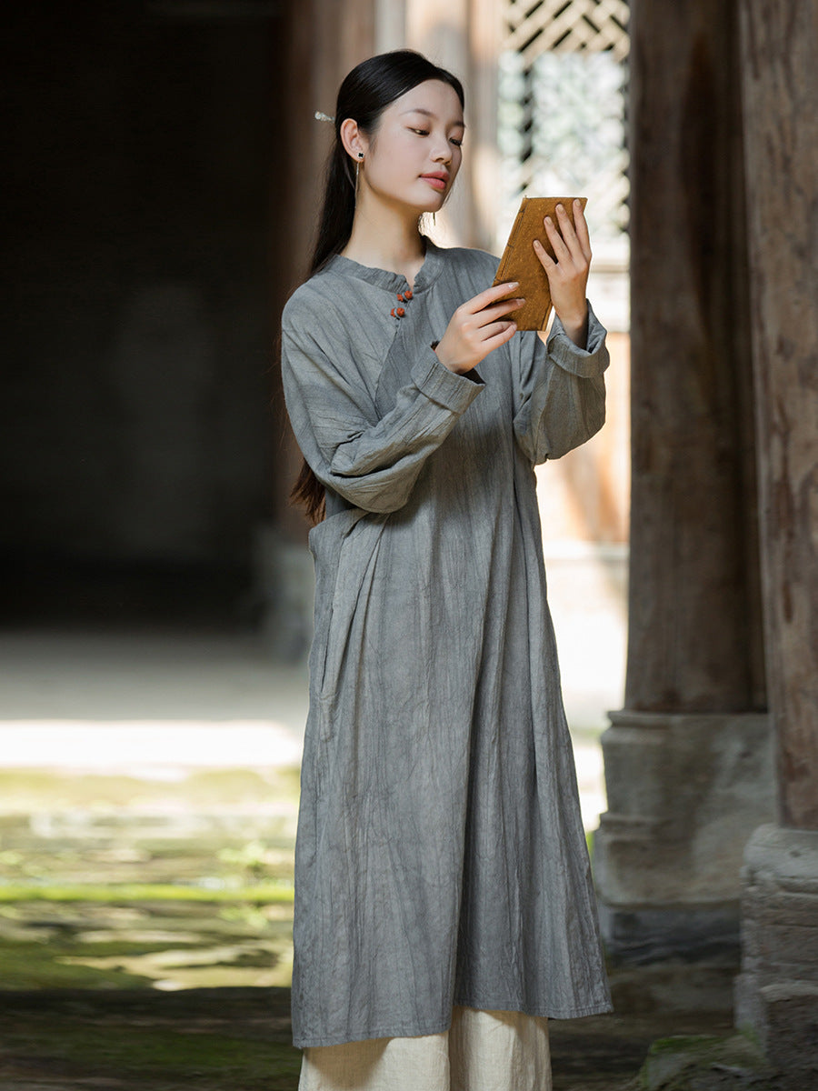 Women Autumn Vintage Tie-dye Ramie Robe Dress BA1042