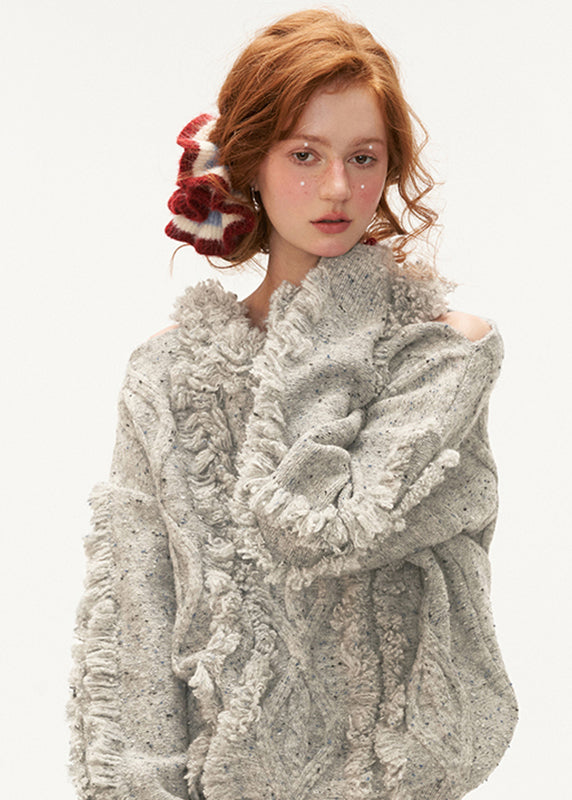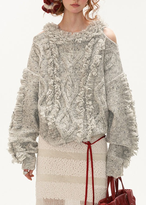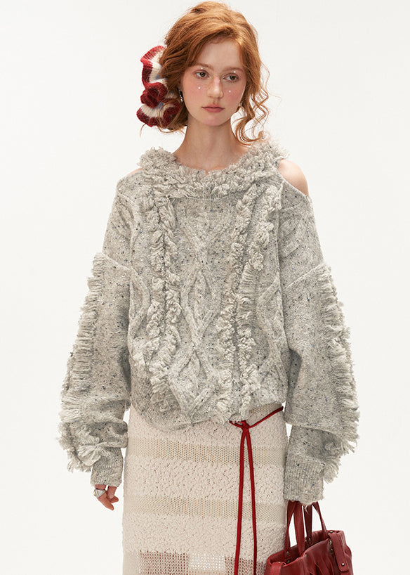 Women Blue Cold Shoulder Tassel Thick Cotton Knit Sweaters Winter QX003