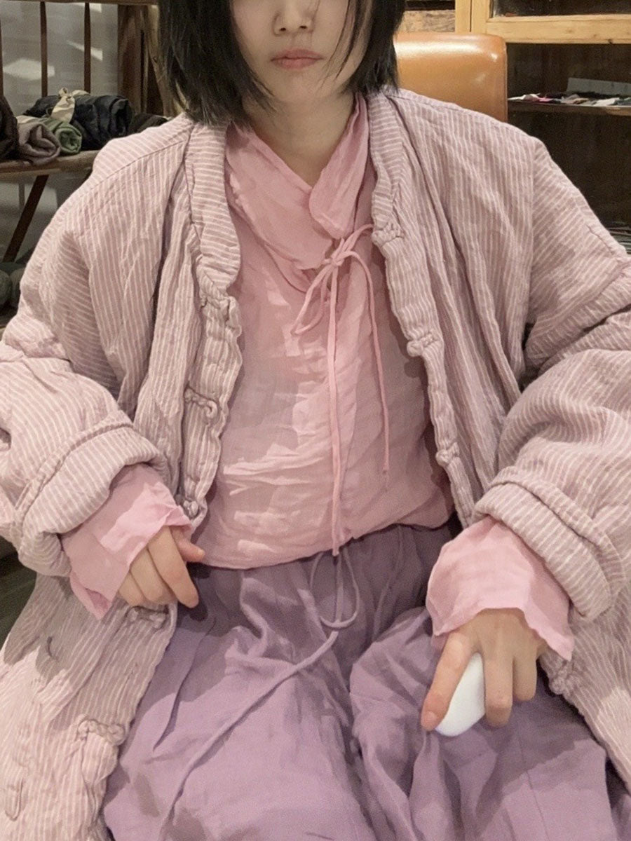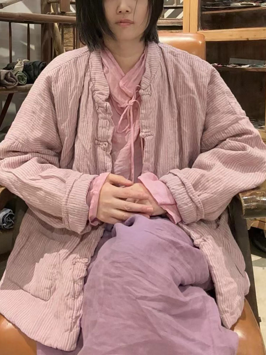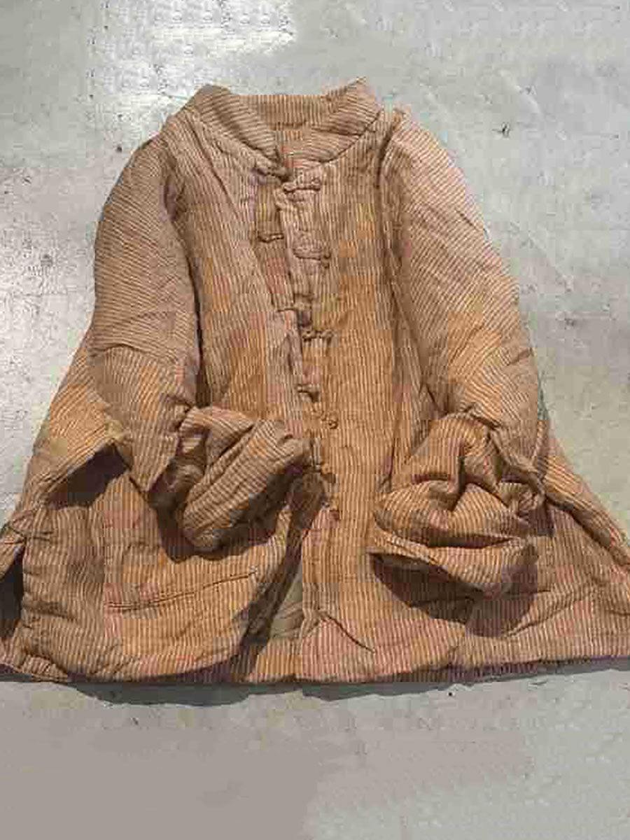 Women Ethnic Autumn Stripe Cotton Stand Collar Coat AV1062