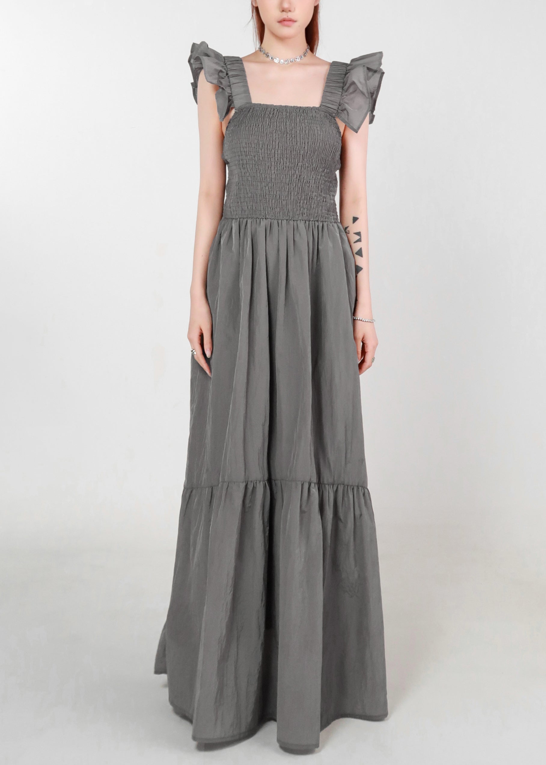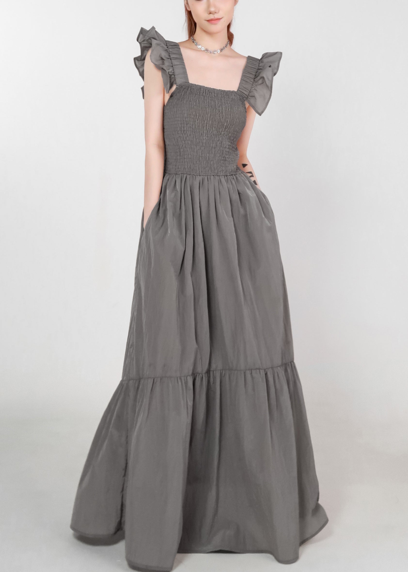 Women Grey Pockets High Waist Cotton Long Dress Summer ZL074