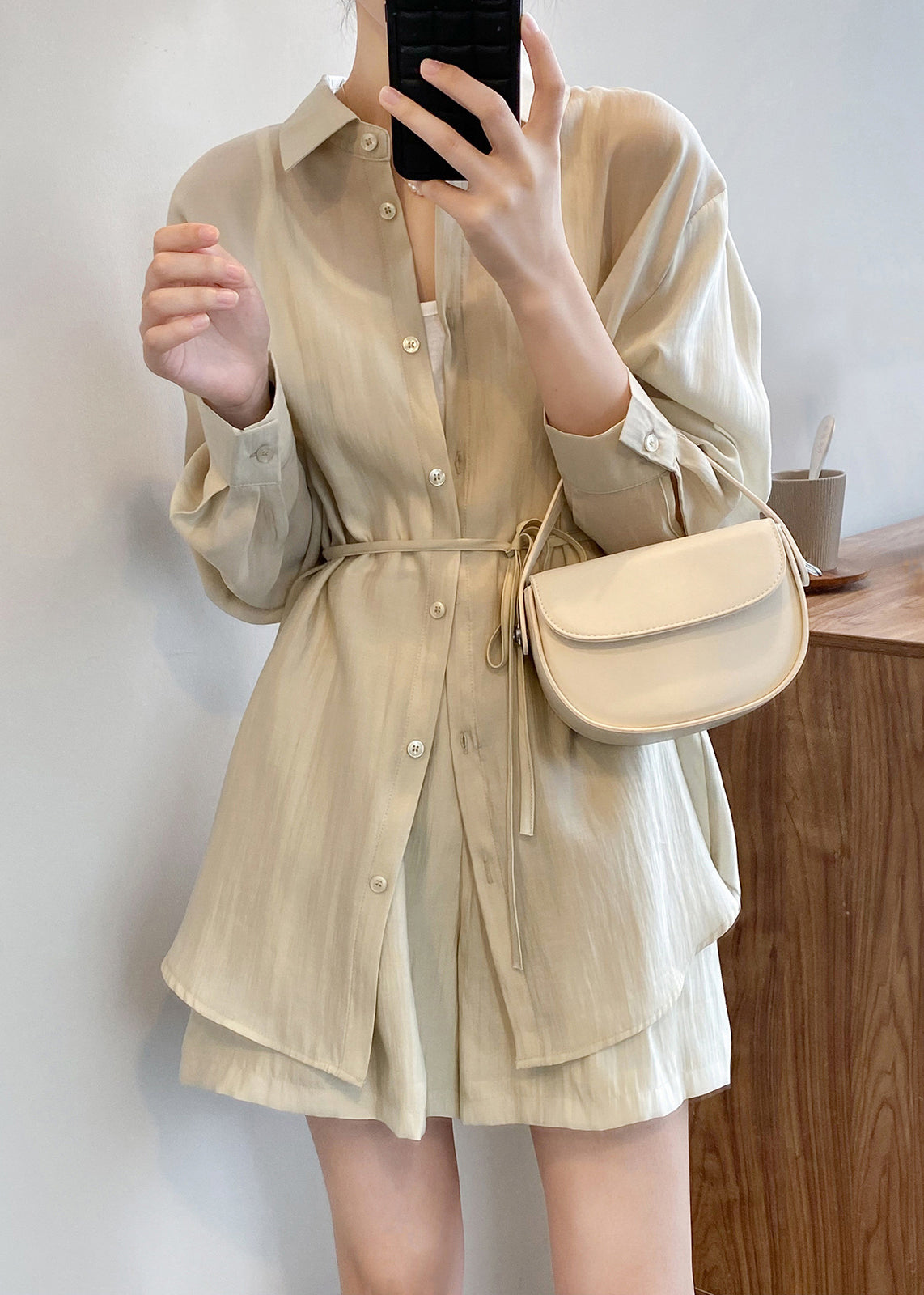 Women Light Green Lace Up Solid Silk Two Pieces Set Spring