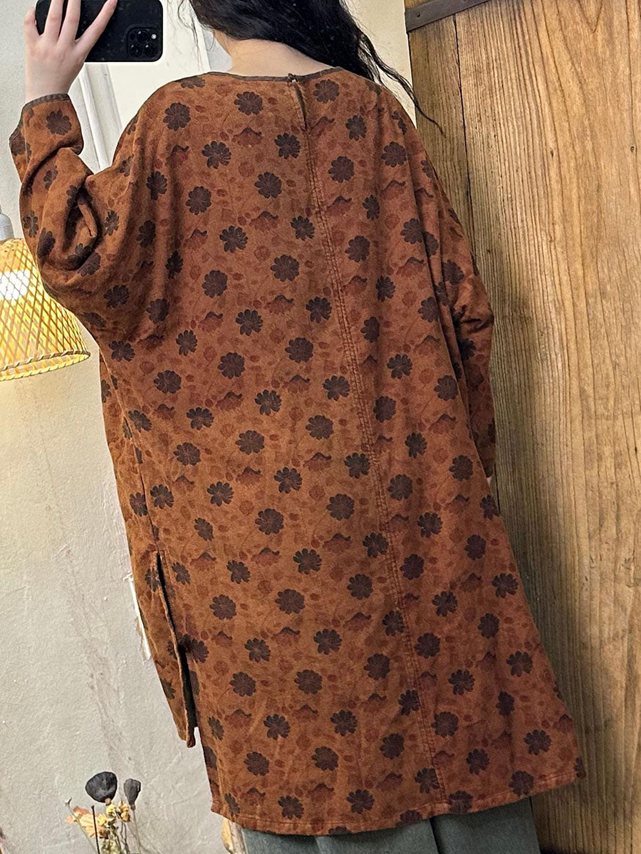 Women Retro Autumn Flower O-Neck Cotton Long Blouse AV1066