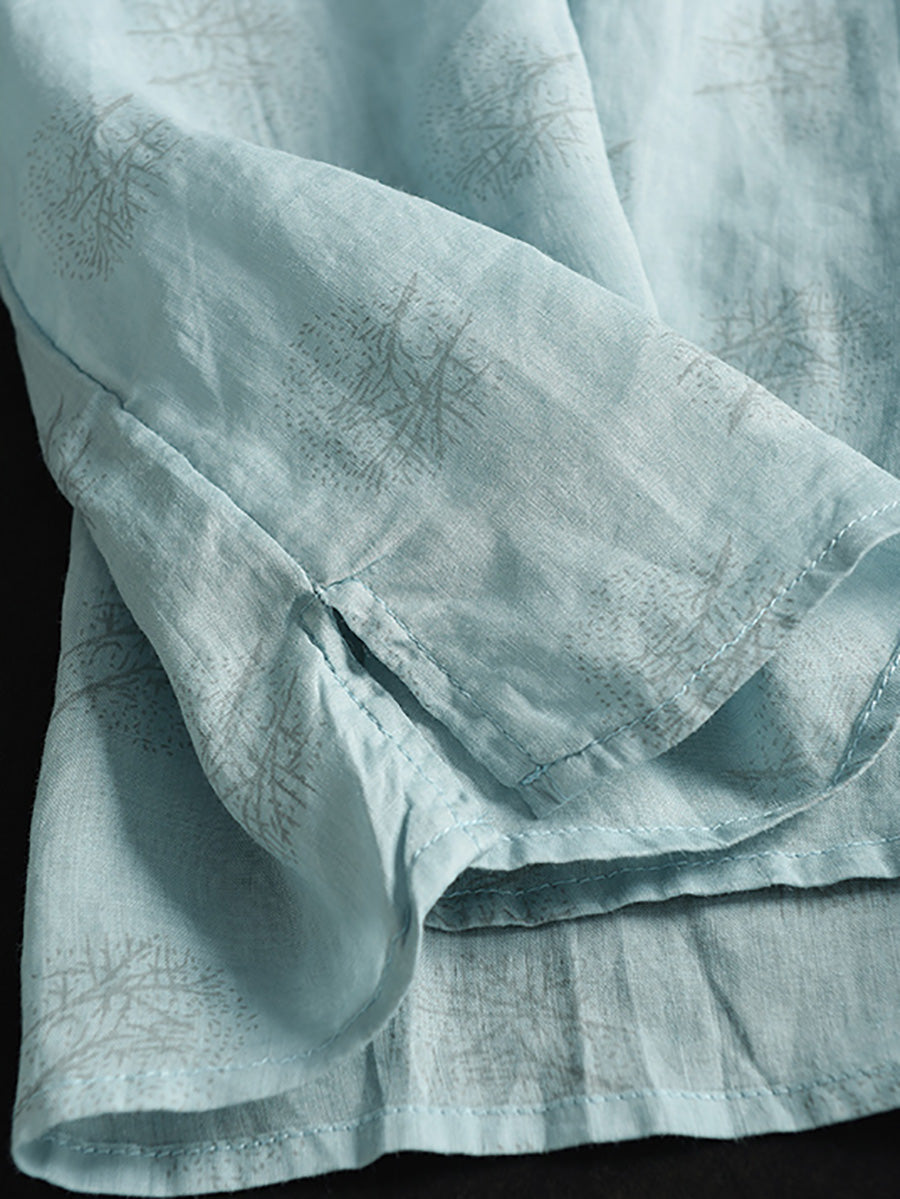 Women Summer Artsy Flower Stand Collar Ramie Shirt LL040