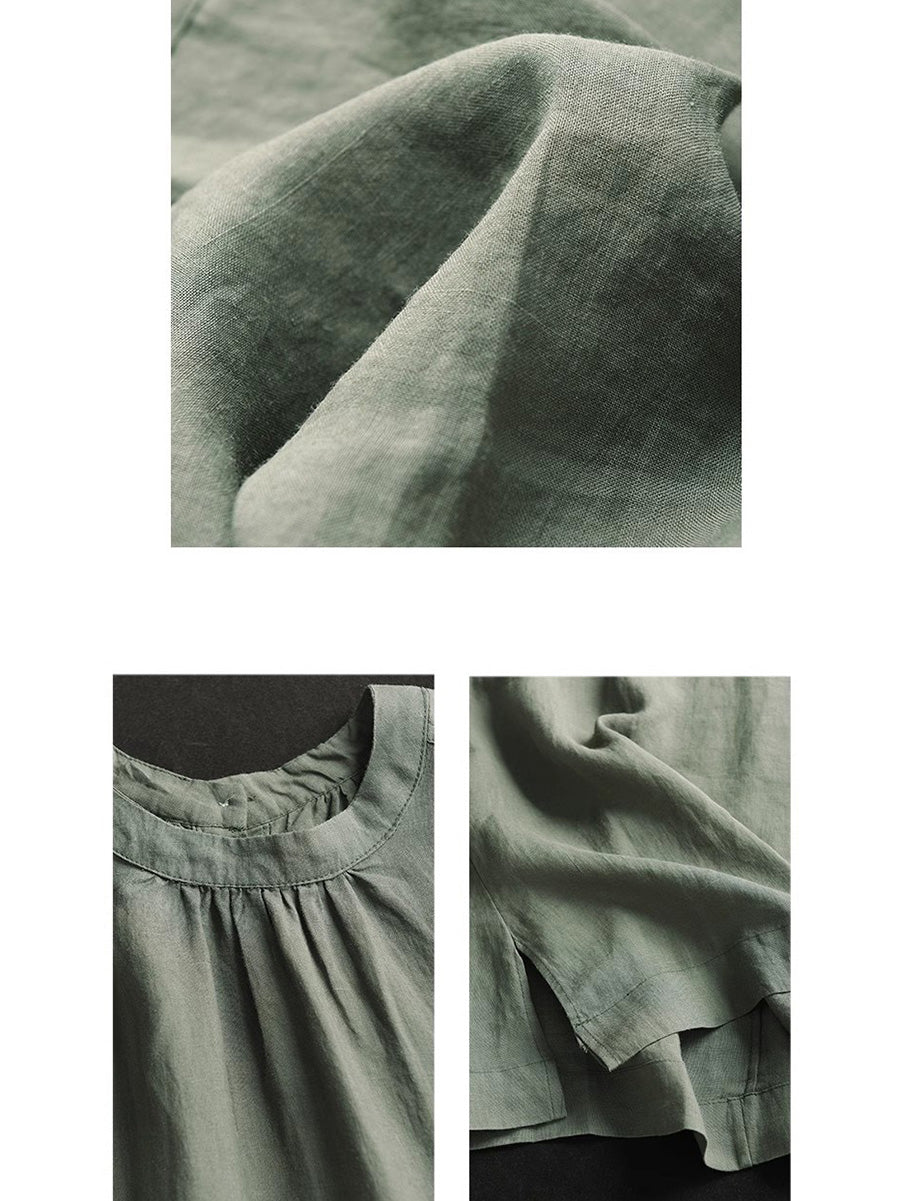 Crafted from premium-grade linen, this exquisite dress boasts a timeless solid pattern, an elegant O-neck collar, and delicate short raglan sleeves. Complete with a practical split hem and a convenient pocket, it's the must-have addition to your sophisticated spring and summer collection.