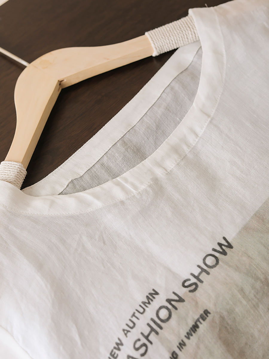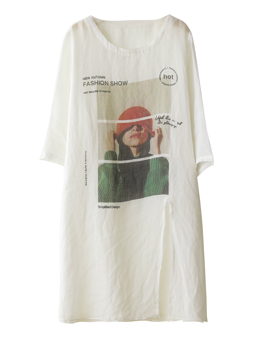 Women Summer Casual Split Hem Print O-Neck Ramie Shirt LL042