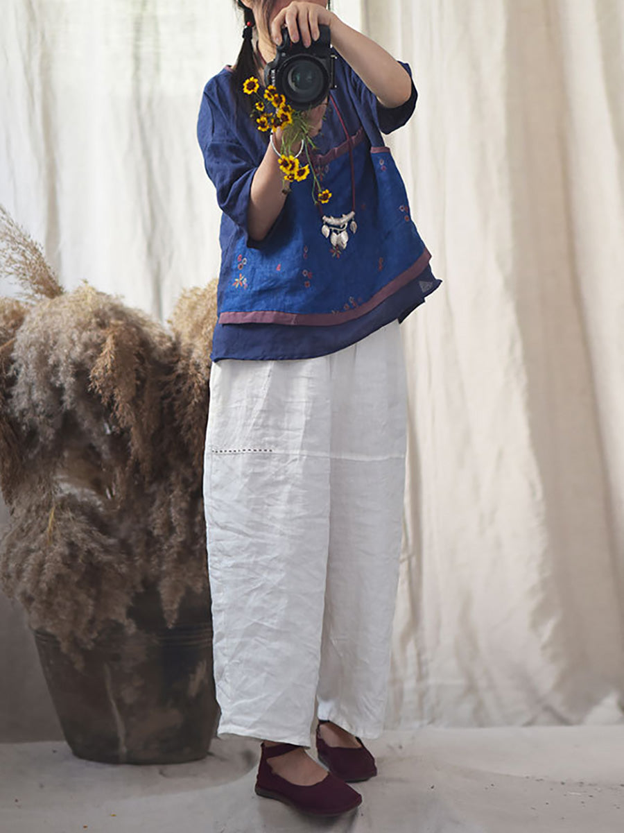 Women Summer Ethnic Flower Spliced O-Neck Ramie Shirt CC016