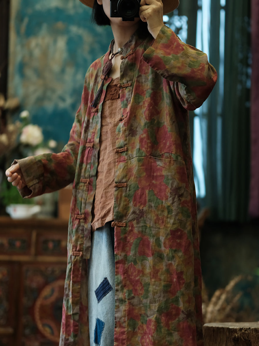 Women Summer Retro Flower Button-up Long Ramie Shirt FG1041