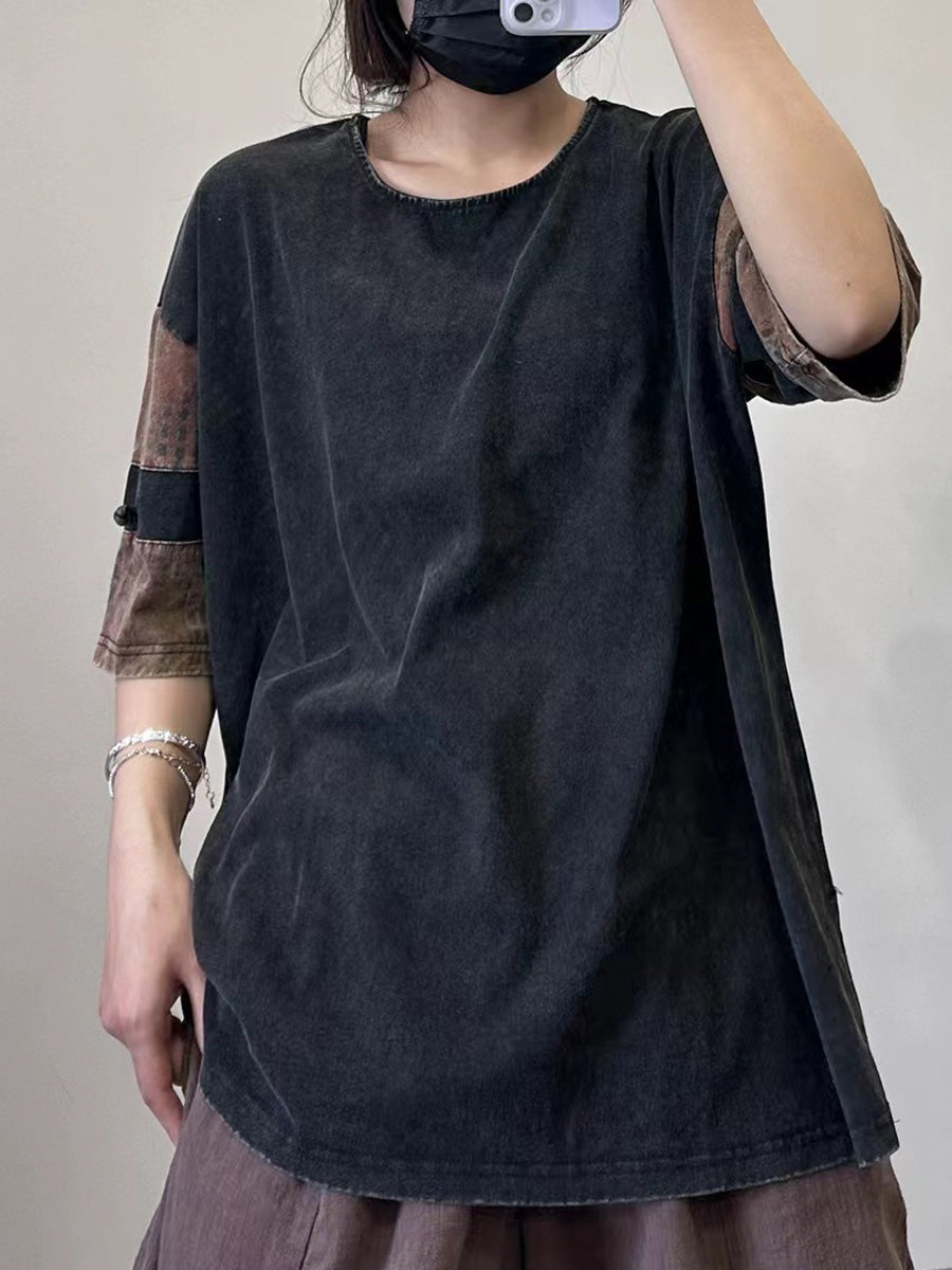 Women Summer Retro Spliced O-neck Worn Cotton Shirt CC023