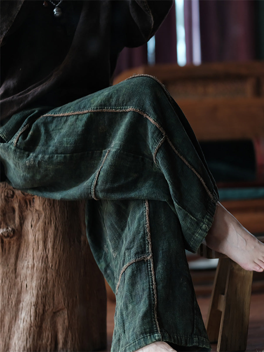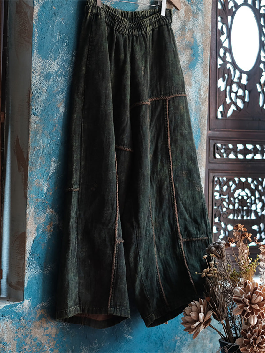 Women Summer Retro Spliced Wide-leg Cotton Pants FD013