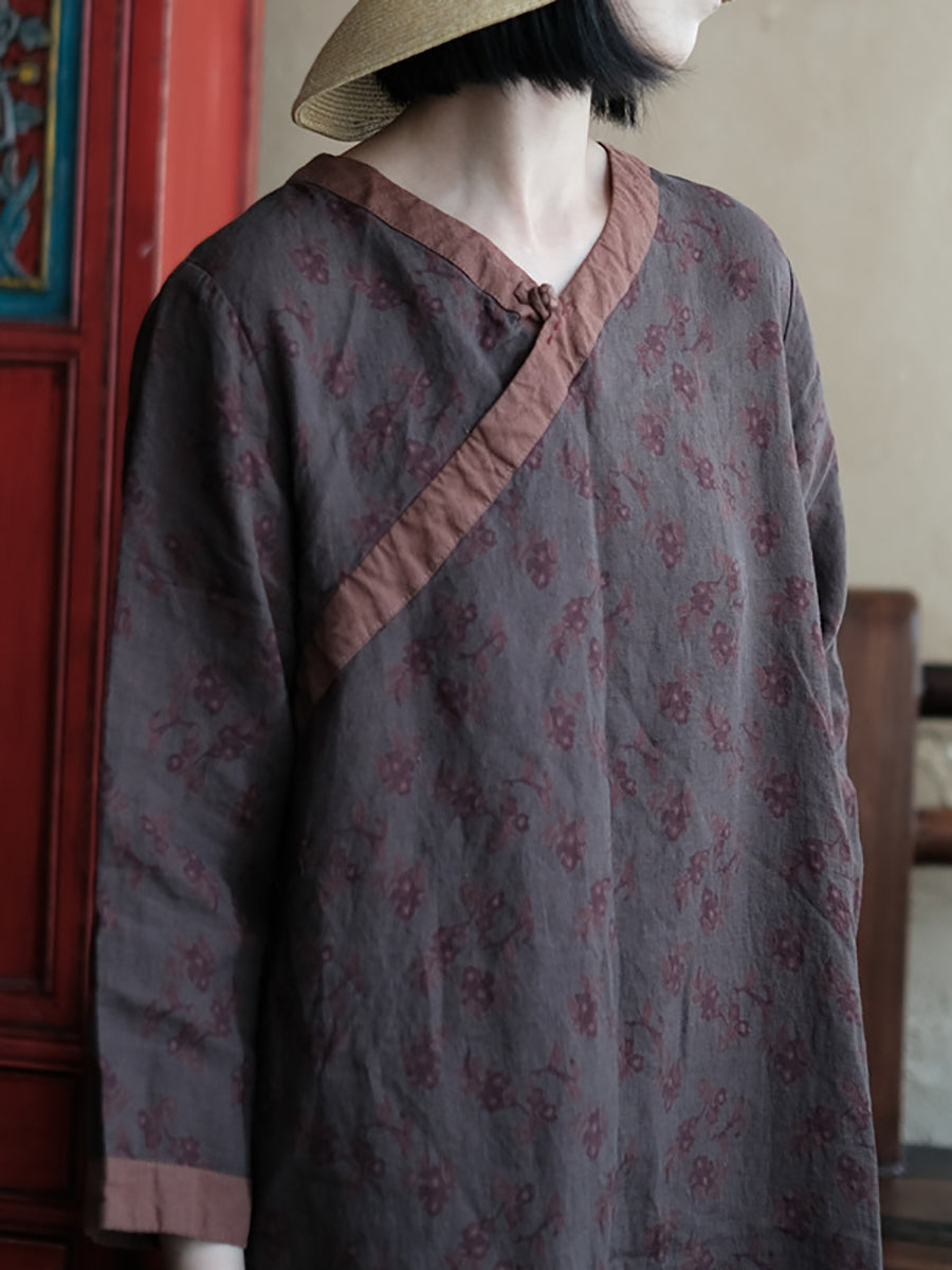 Women Summer Vintage Floral Spliced V-Neck Linen Dress II1013