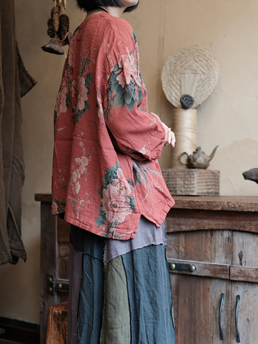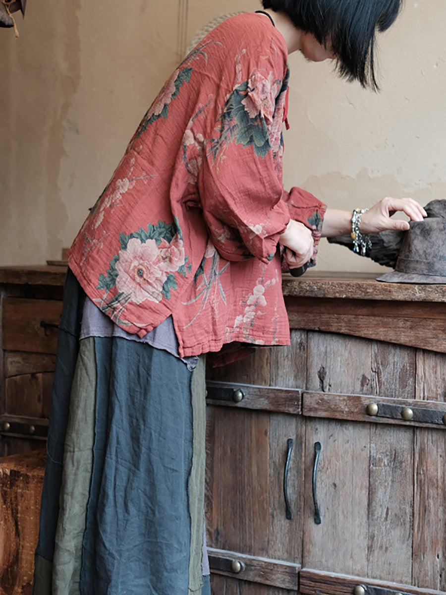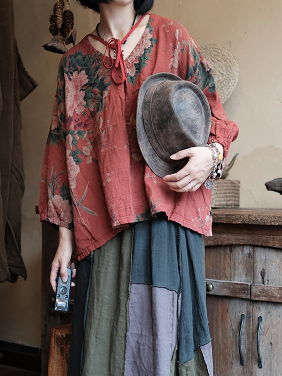 Women Summer Vintage Flower V-Neck 100%Cotton Shirt RR028