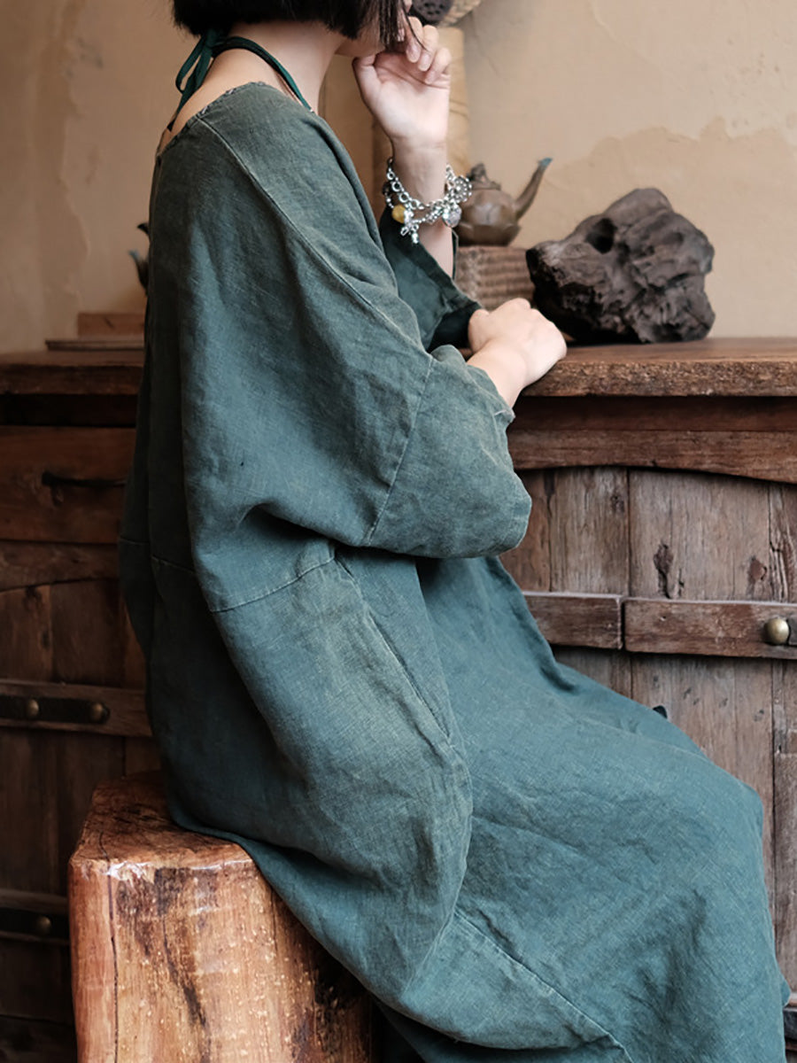 Women Summer Vintage Spliced V-Neck 100%Linen Dress CC048
