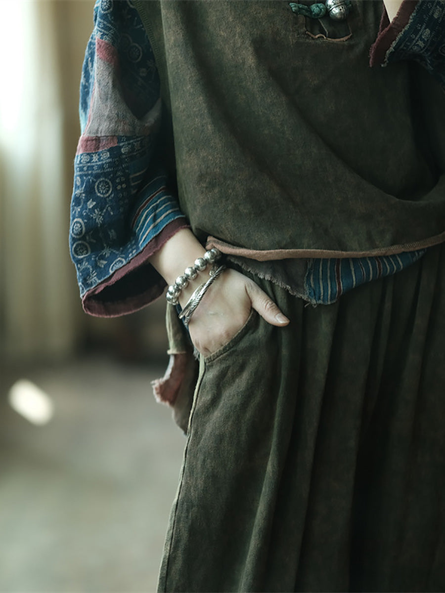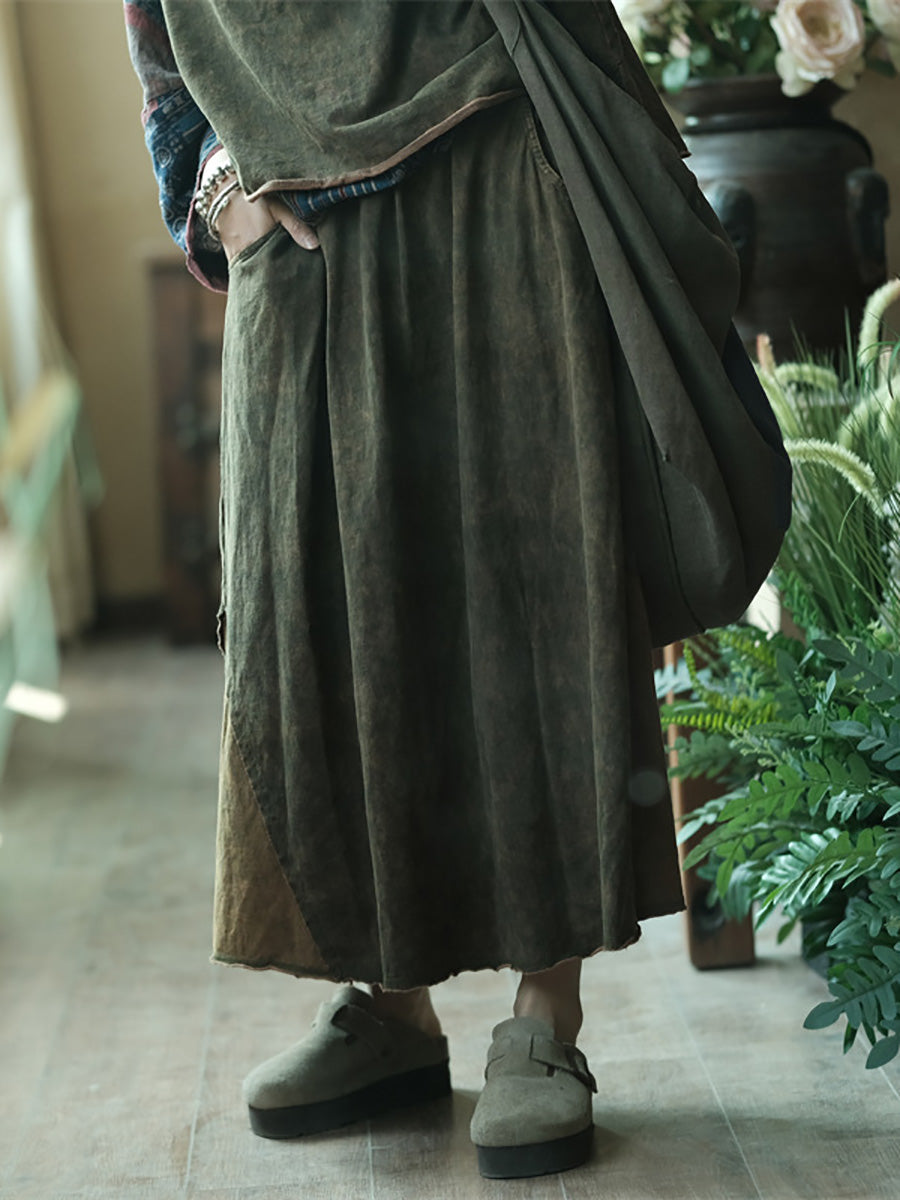 Women Summer Vintage Spliced Worn Loose Cotton Skirt CC040