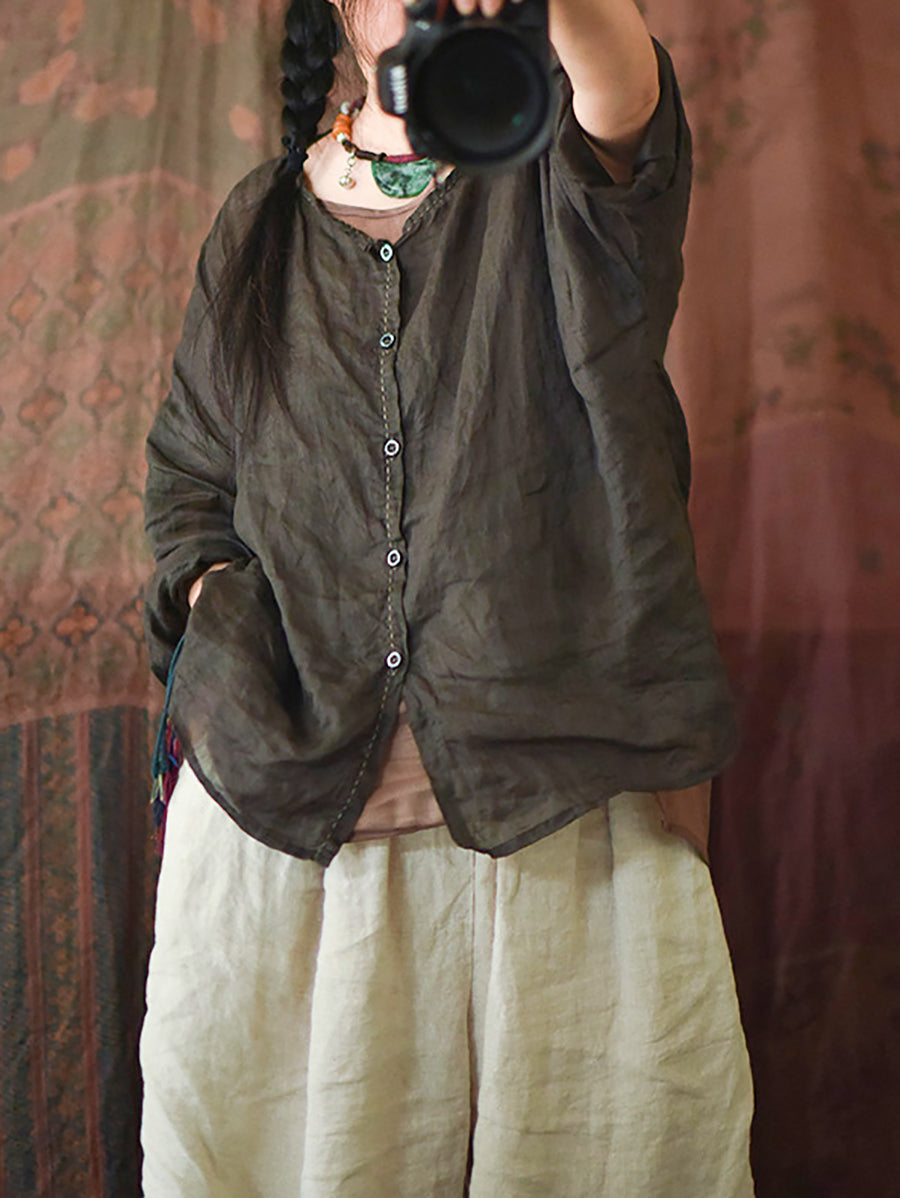 Women Summer Vintage Stitching Button Ramie Blouse AT1063