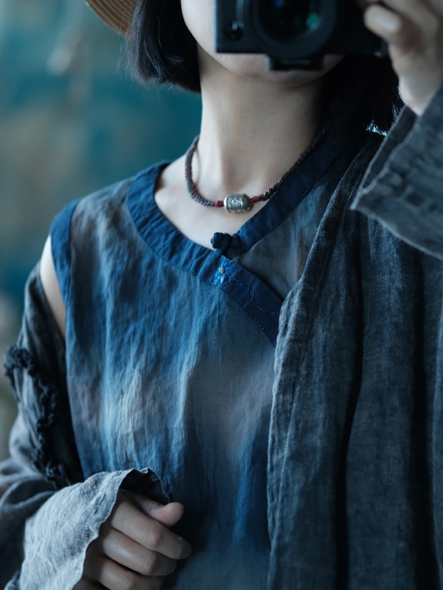 Indulge in the luxurious quality of ramie with the striking tie-dye pattern of this elegant vest. Its chic V-neck design evokes an artistic aura, making it an essential addition to any sophisticated woman's spring and summer collection. Ideal for the warmer months, this piece exudes exclusivity and refinement.