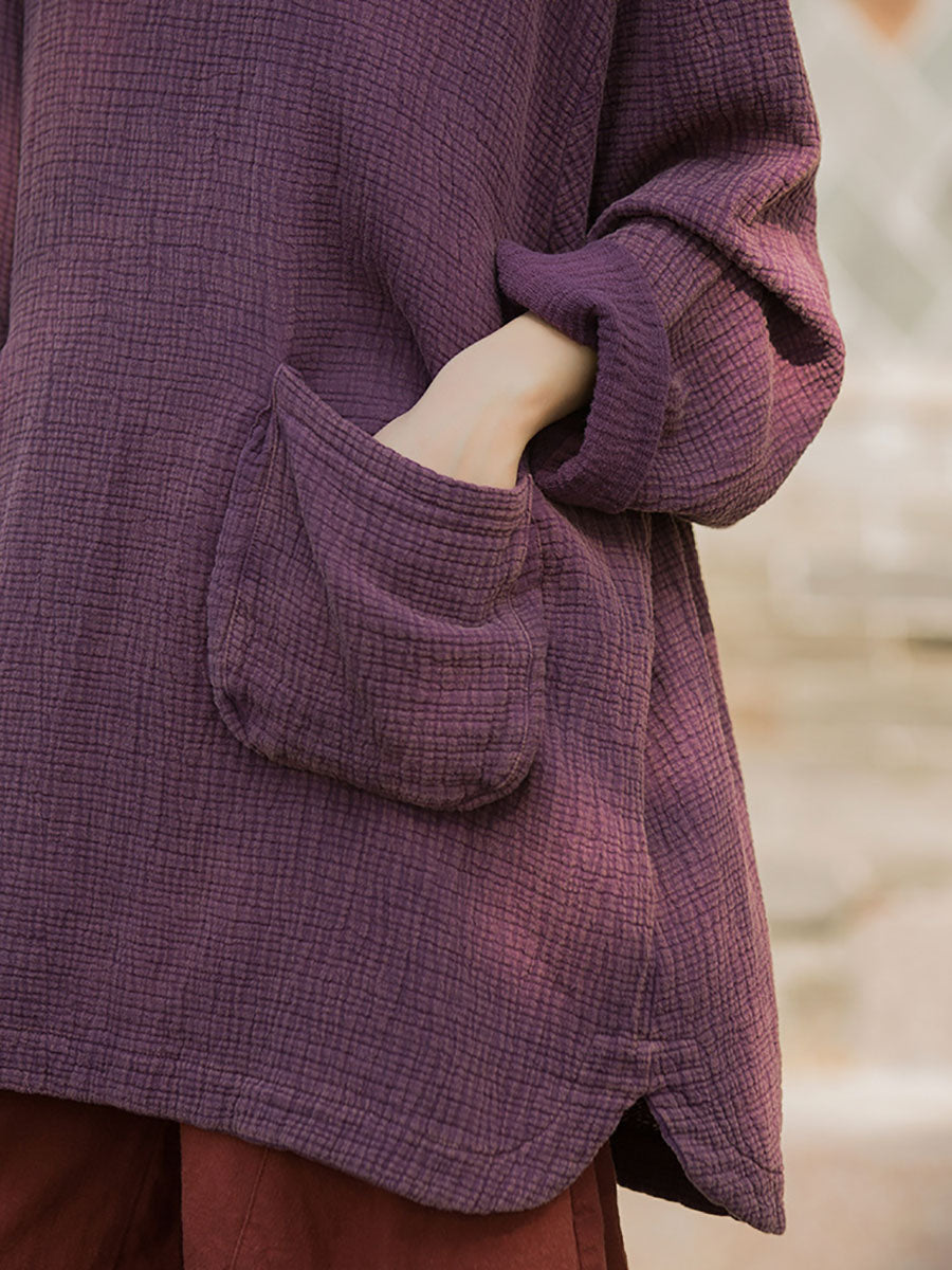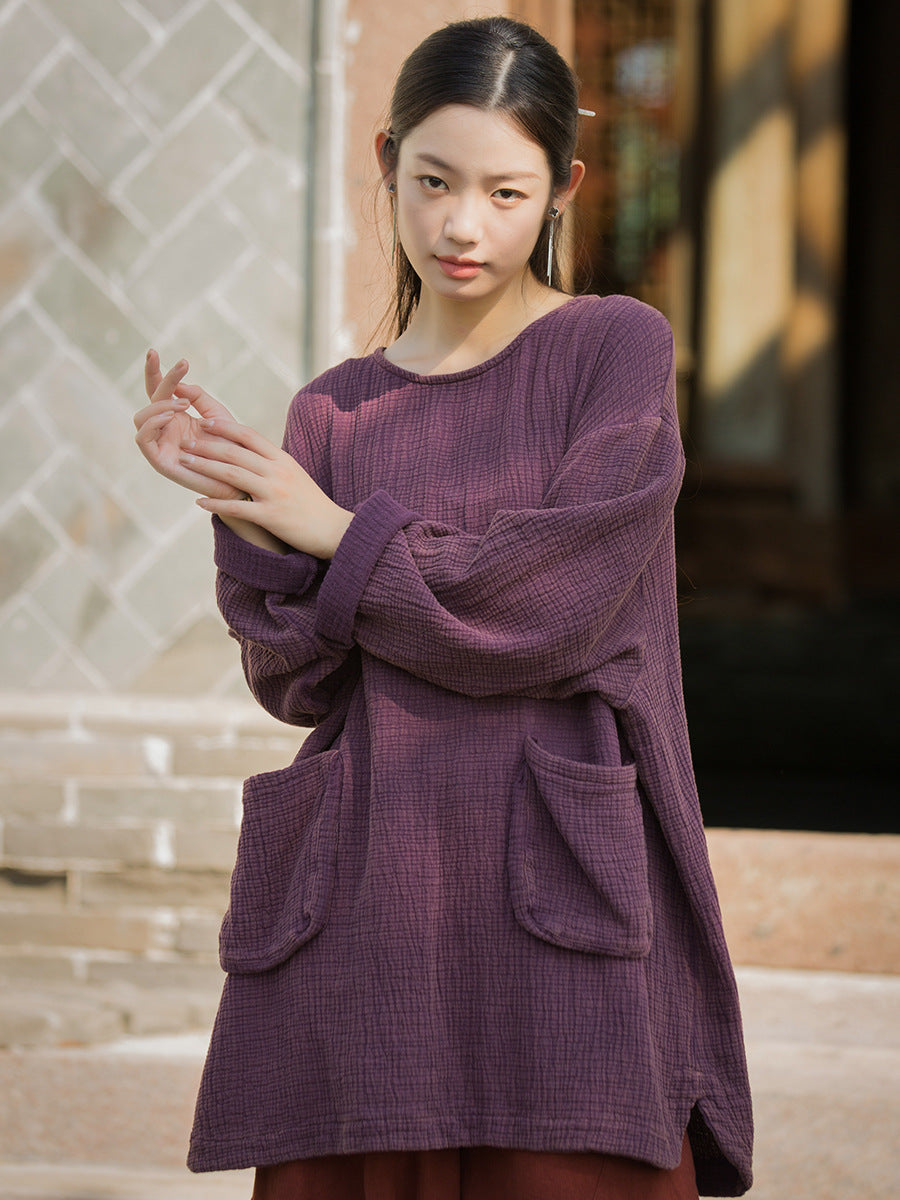 Women Vintage Autumn Solid O-Neck Cotton Blouse AV1021