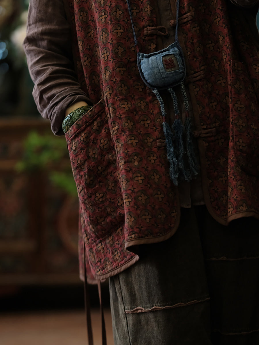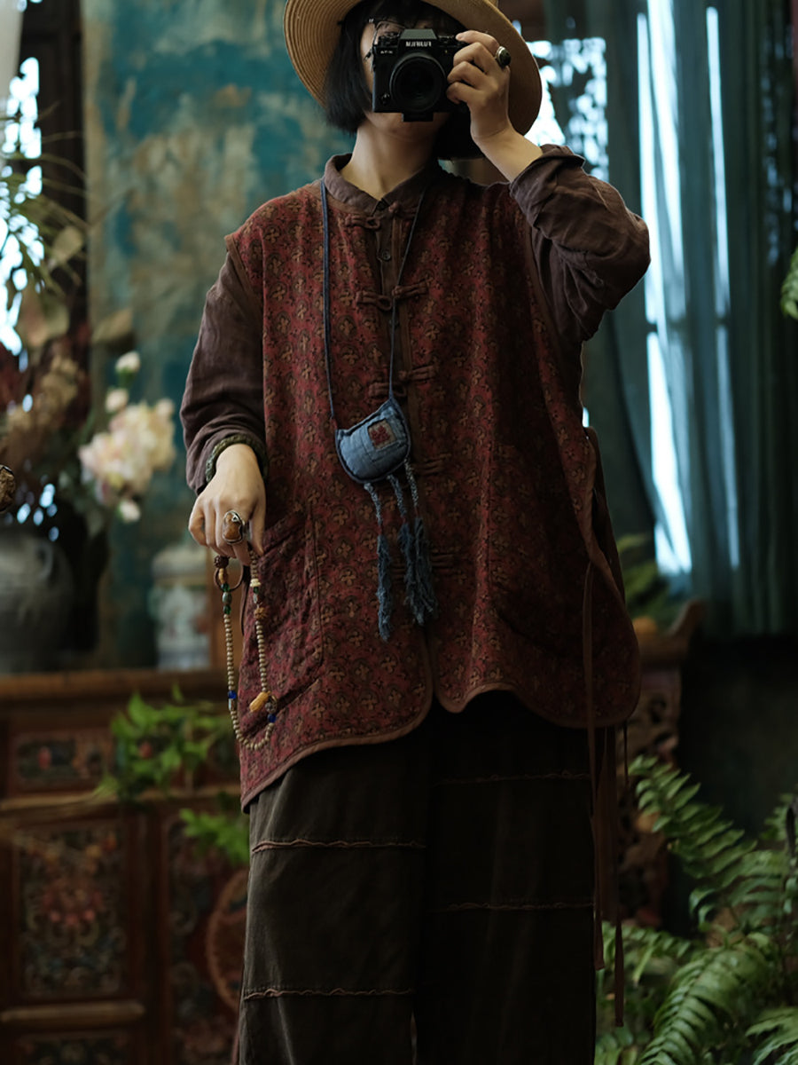 Women Vintage Floral Side Strap Pocket 100%Cotton Vest AT1045