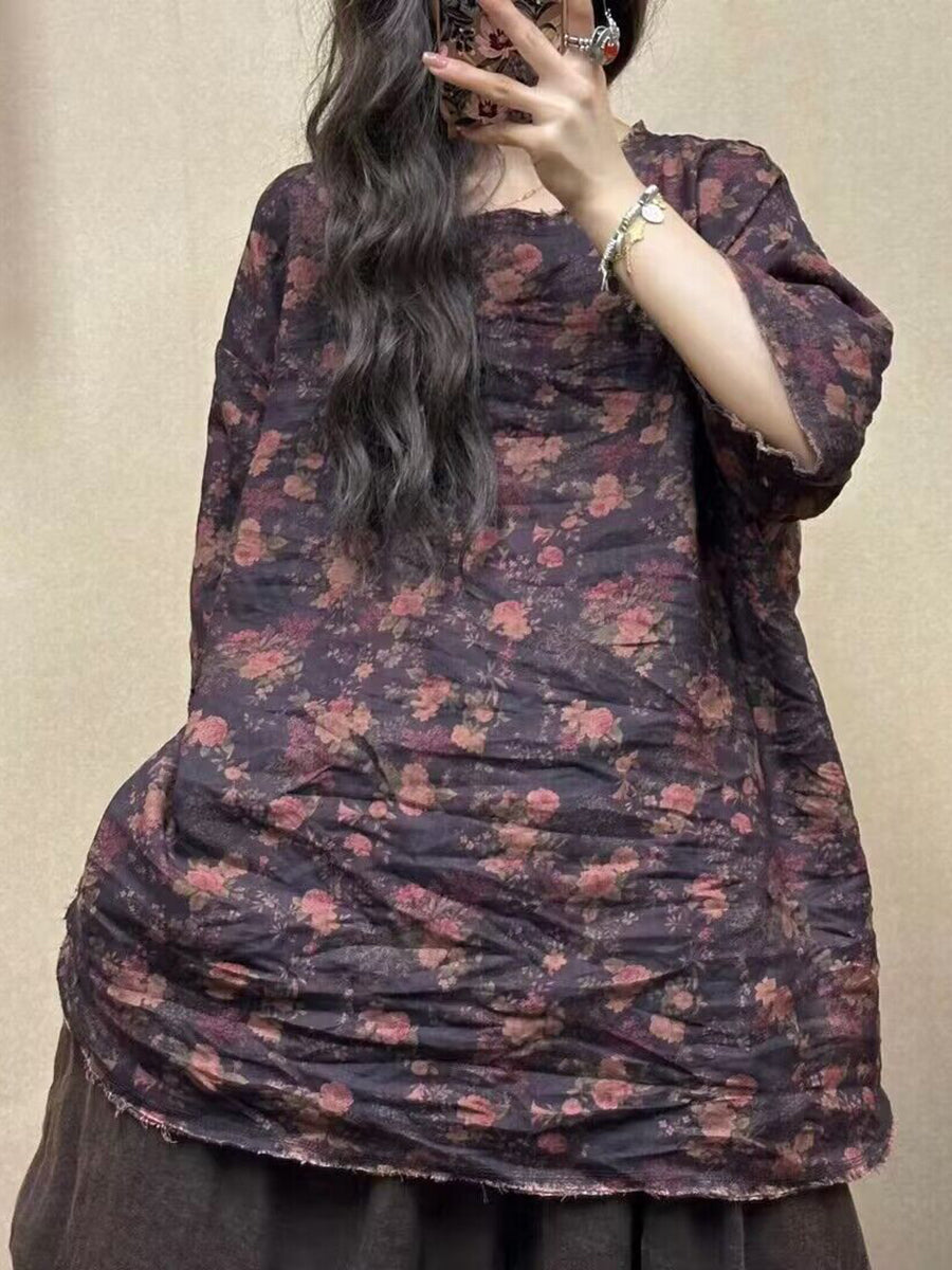 Women Vintage Flower Linen Summer Loose Shirt CO1018